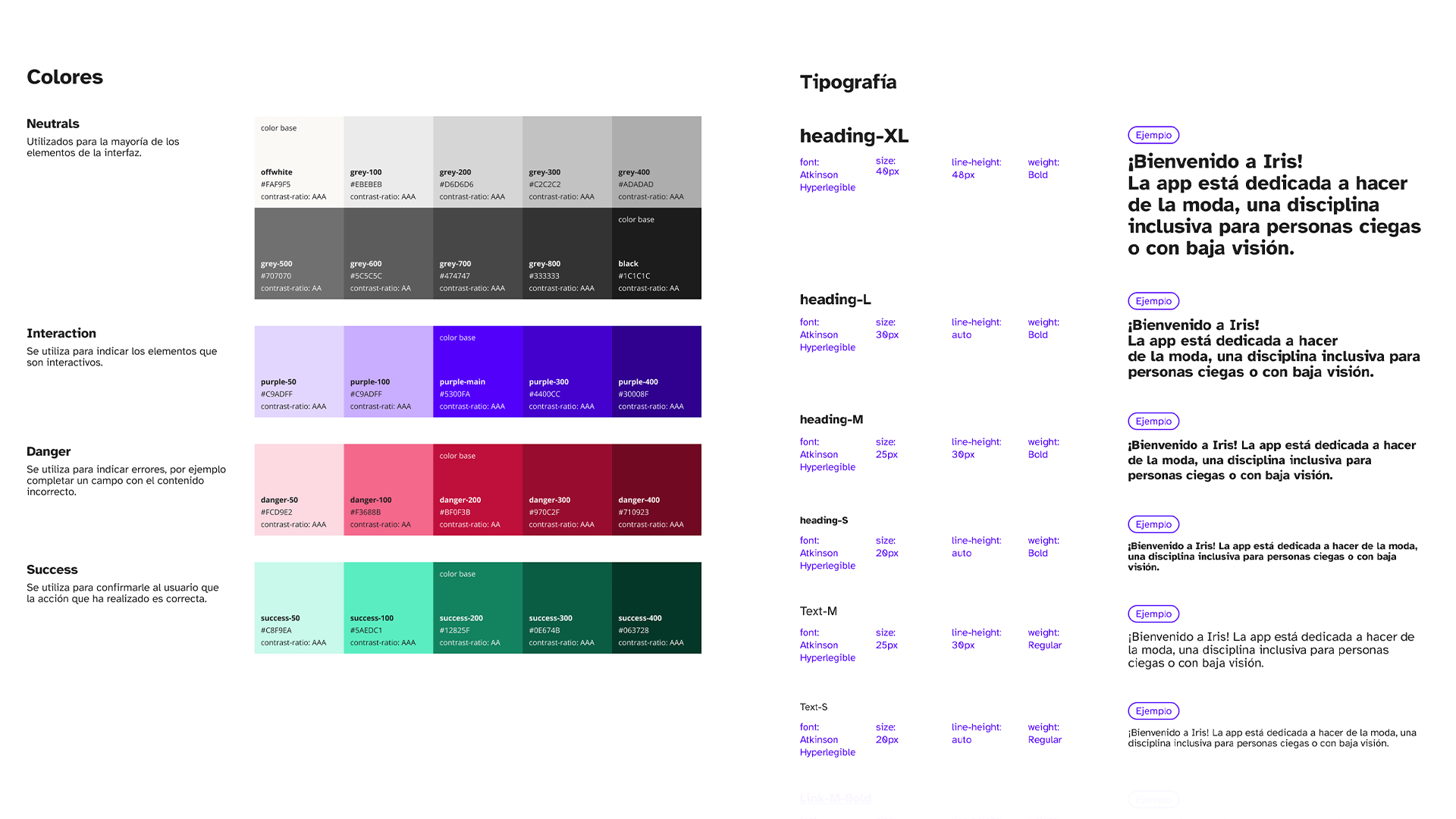 For the visual identity it was key to have accessibility of low vision users in mind. For that reason the color palette was kept simple and with a high contrast and the font selected was Atkinson Hyperlegible, a font designed specifically to improve legibility for low vision individuals.